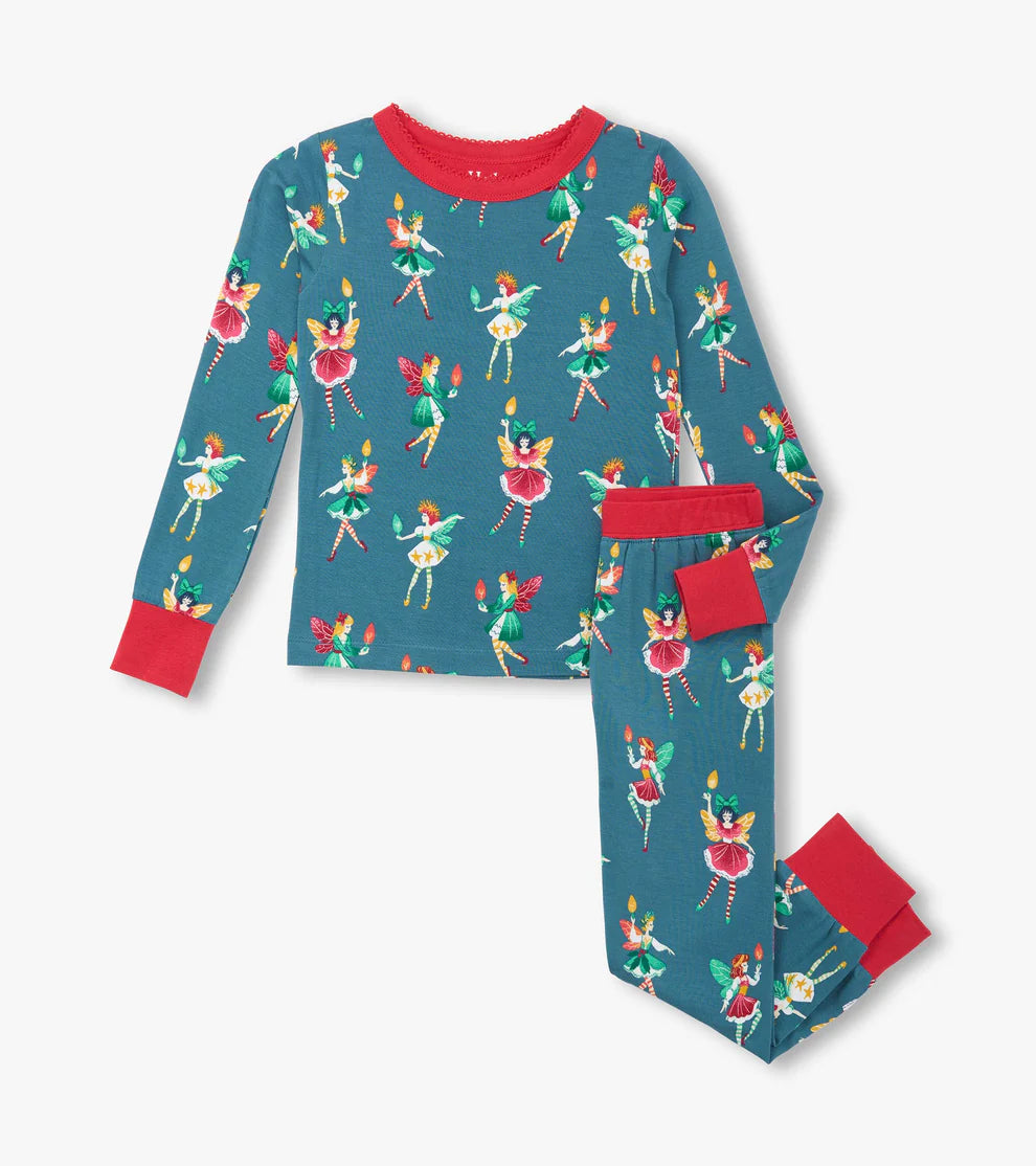 Drift into magical dreams with the Girls Bright Fairies Bamboo Pajama Set, crafted from a soft stretch bamboo blend for ultimate comfort and breathability. This cozy set features a teal blue base adorned with a whimsical all-over print of holiday fairies in red and green costumes, complete with striped stockings, playful wings, and glowing candles. The long-sleeve top includes a crew neckline with delicate doily-like trim and contrasting red ribbed details at the neck and cuffs, while the matching full-length bottoms have an elastic waistband and cuffed hems for a snug fit.
