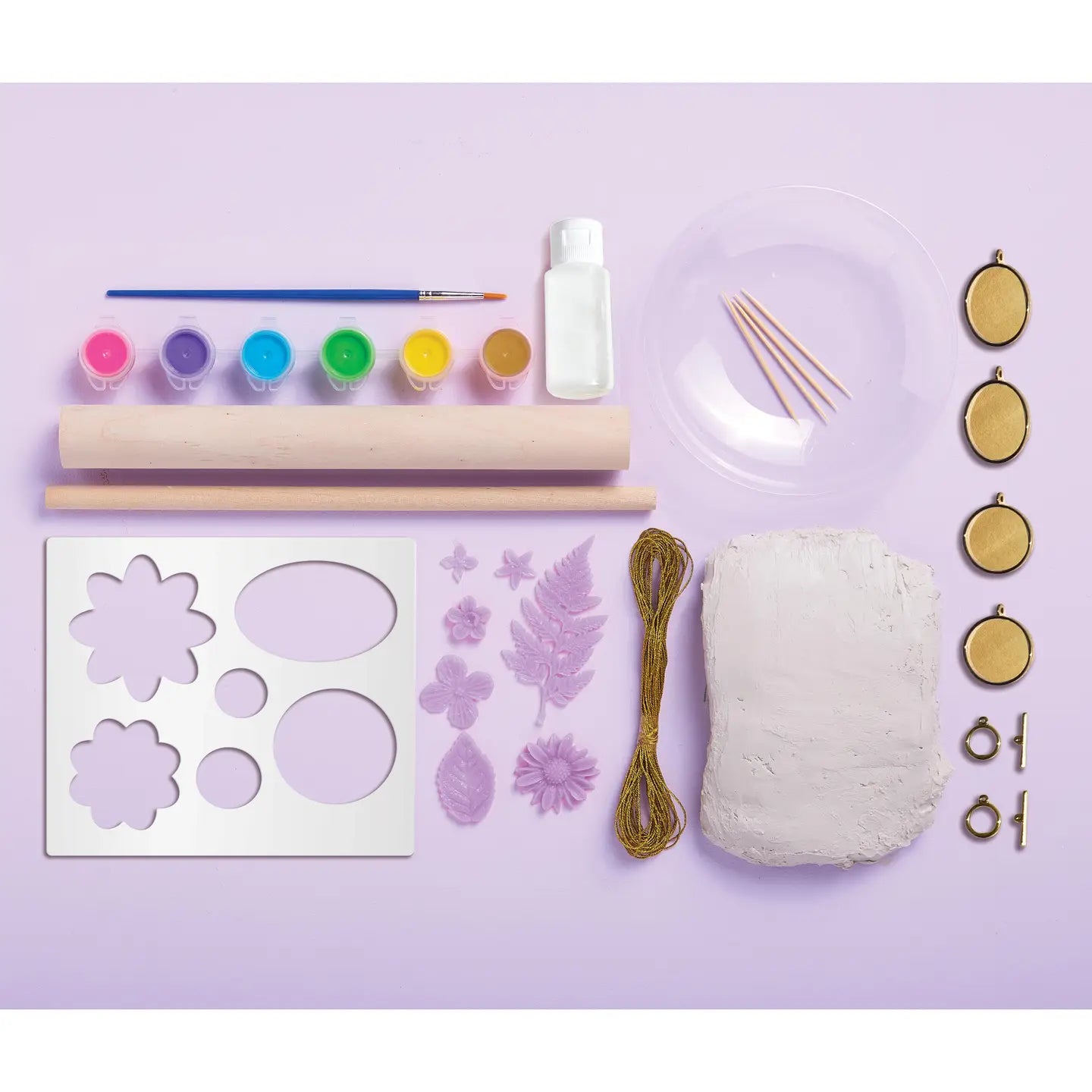 • 1 lb of air-dry clay, a wooden rolling pin, 7 botanical stamps, stencil, 6 paints, glaze, paintbrush, 4 jewelry pendants and clasps, bowl mold, rod for wall art and gold floss.