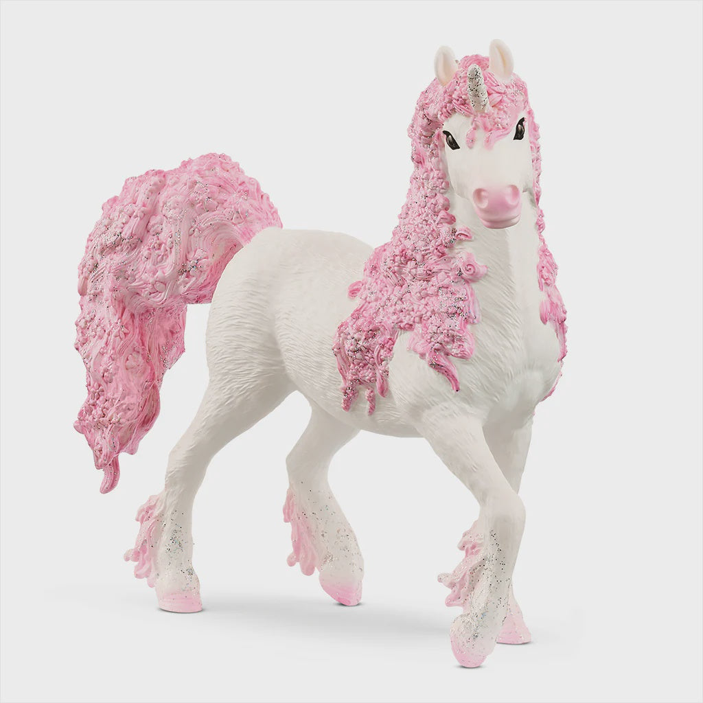 The flower unicorn mare looks simply enchanting with her lush mane of delicate, pink flowers. Even her thick tail is a mass of flowers. Her bright white coat shines like snow in the sun. A dazzling beauty!
