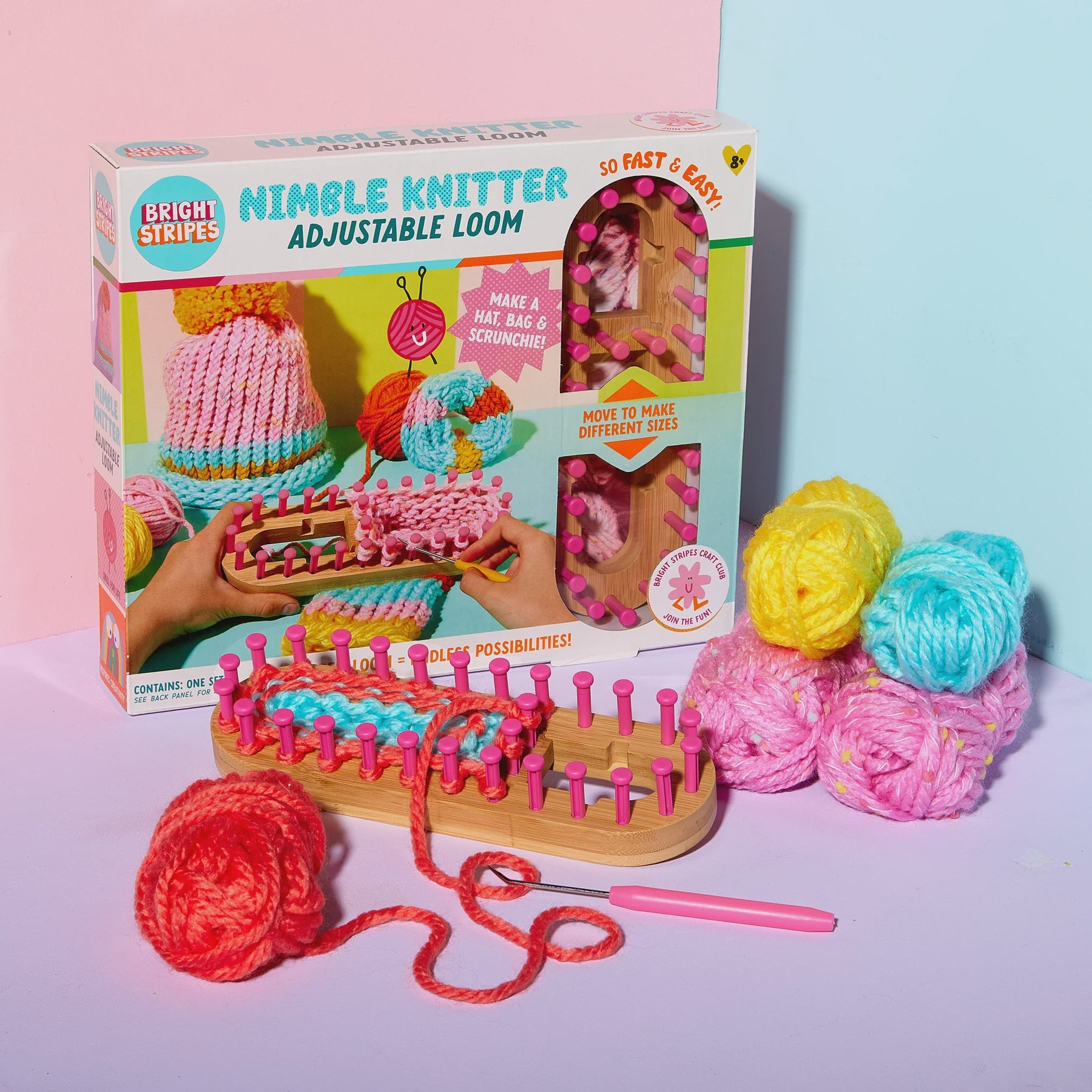 It's so easy to knit a hat, bag, and scrunchie with the adjustable bamboo knitting loom. Just place the puzzle piece into the loom to change the width 4 sizes in one! The chunky yarn knits up quick, in beautiful flecked pink and bright pastel tones. Great for beginning knitters. Includes a Craft Club bonus door sign to let people know that you're busy crafting! The easy-to-follow instruction guide will get you knitting in no time!